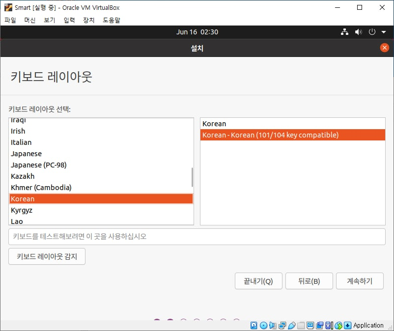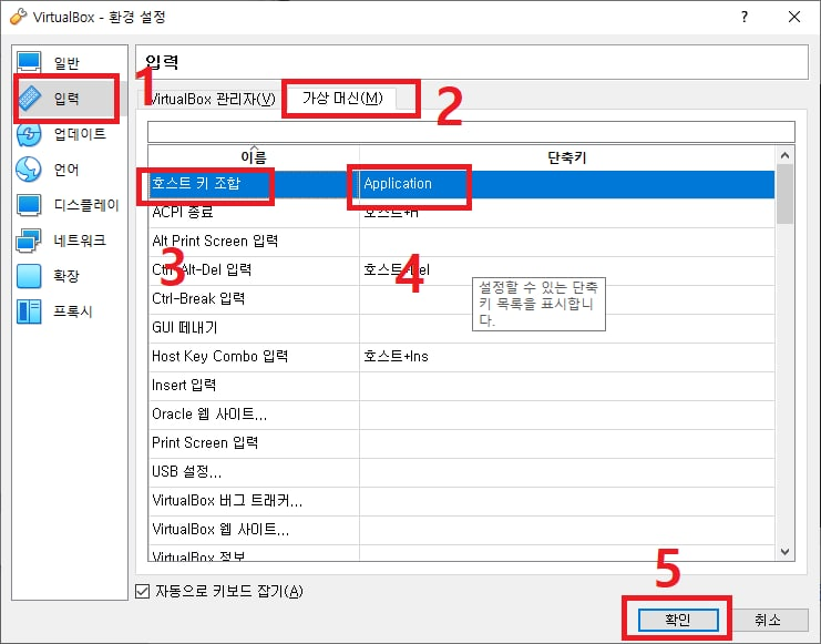 2. 마우스잡기 해제키 설정: 버추얼박스 창을 클릭했을 때 마우스가 잡혀서 안보이게 되고 이를 해제하기 위한 단축키 설정