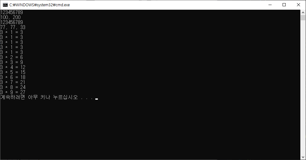 Console.WriteLine("{0}, {0}, {1}", 77, 33); // 같은 수를 여러번 출력할 수 있다.