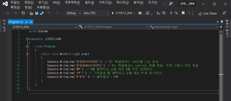 210512 C#_ \(백슬래쉬), 한줄띄움, "\" 출력, "(따옴표)출력 본문