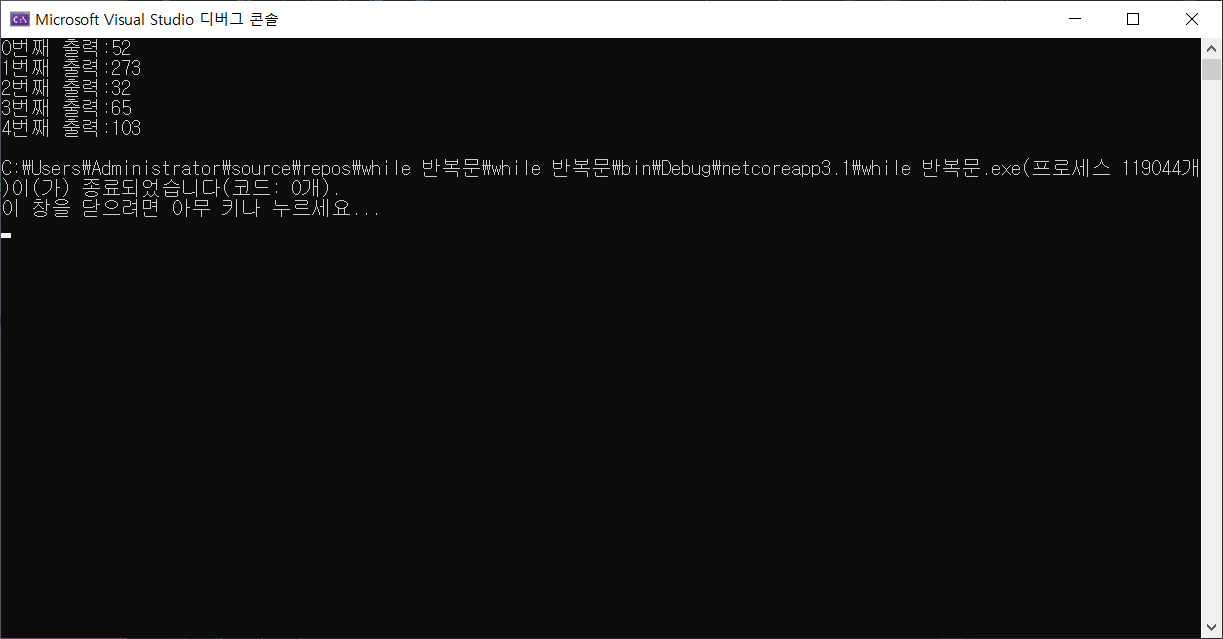 Console.WriteLine(i + "번째 출력:" + intArray[i]);