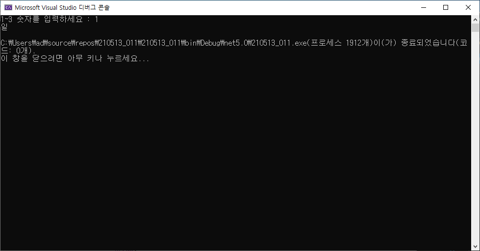 Console.Write("1~3 숫자를 입력하세요 : ");